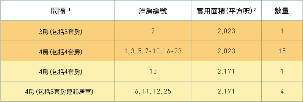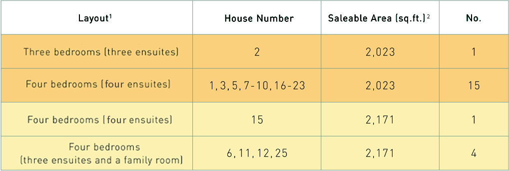 2 The saleable area (including balcony, utility platform and verandah (if any)) is calculated in accordance with Section 8 of the Residential Properties (First-hand Sales) Ordinance (the “Ordinance”). The saleable area excludes the area of every one of the items specified in Part 1 of Schedule 2 of the Ordinance to the extent that it forms part of the residential property. The areas in square feet have been converted from square metres based on a conversion rate of 1 square metre = 10.764 square feet and rounded off to the nearest integer. Please refer to the sales brochure for details.